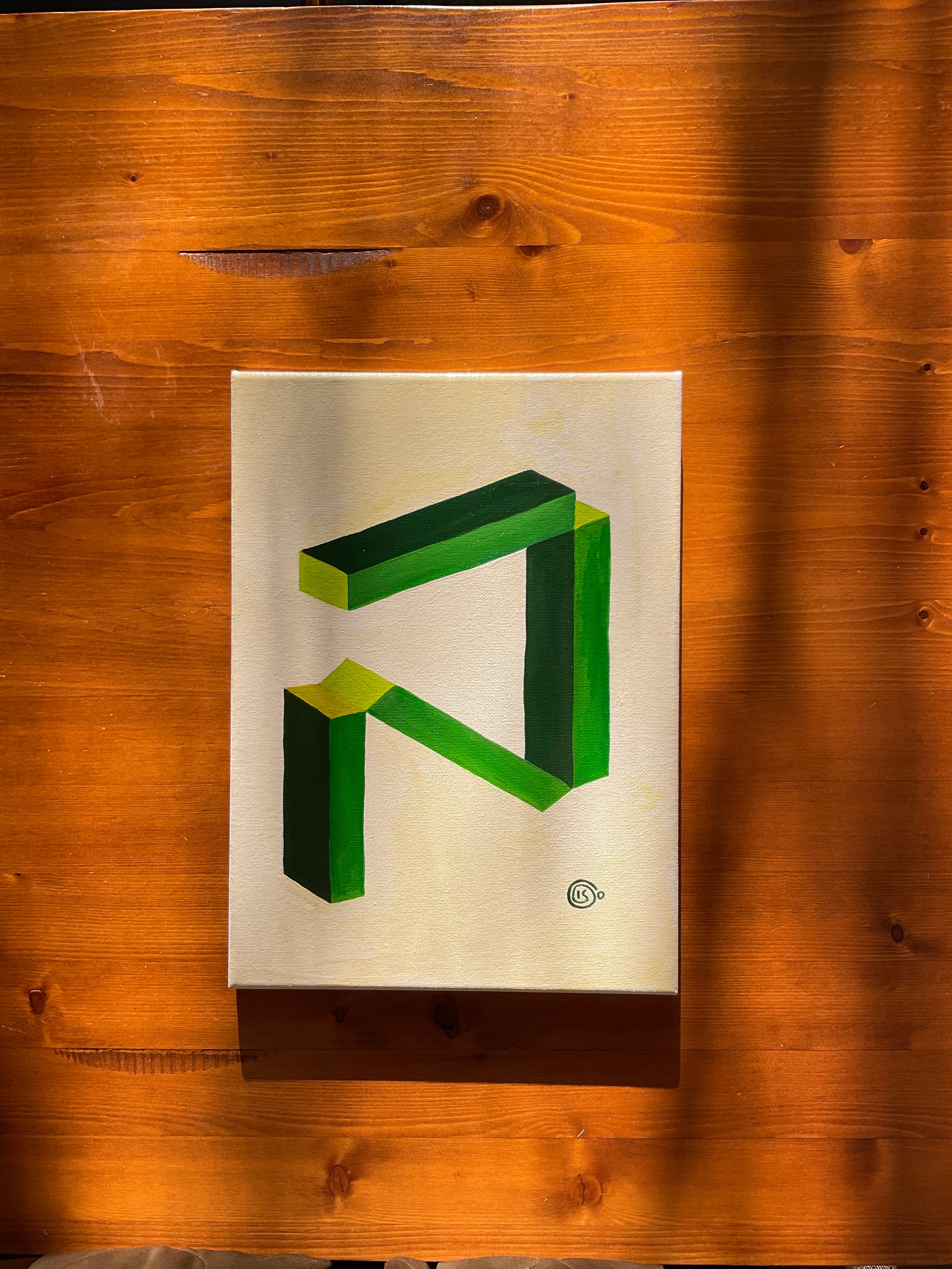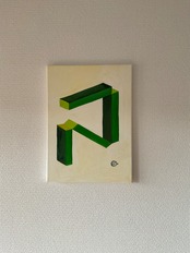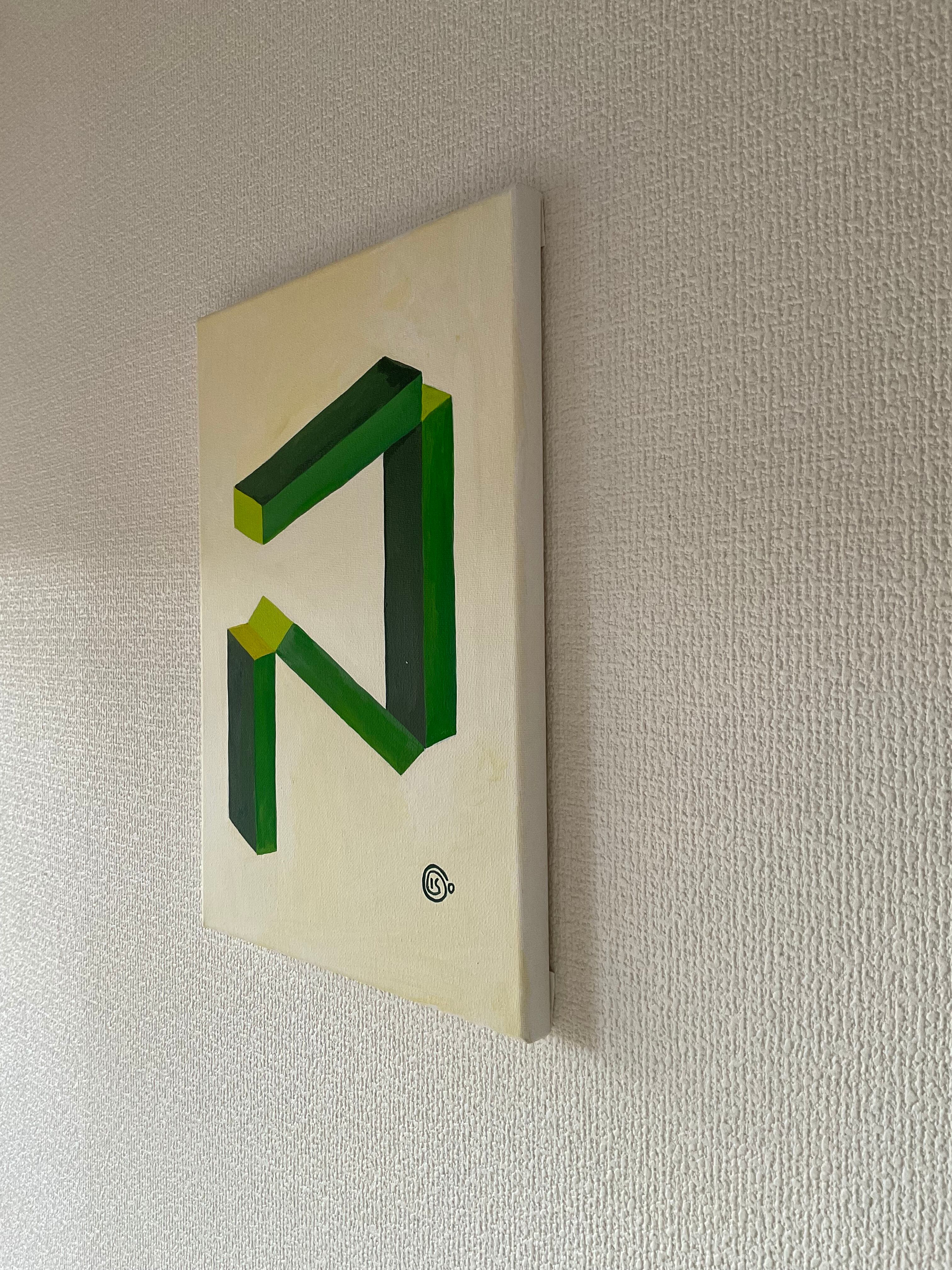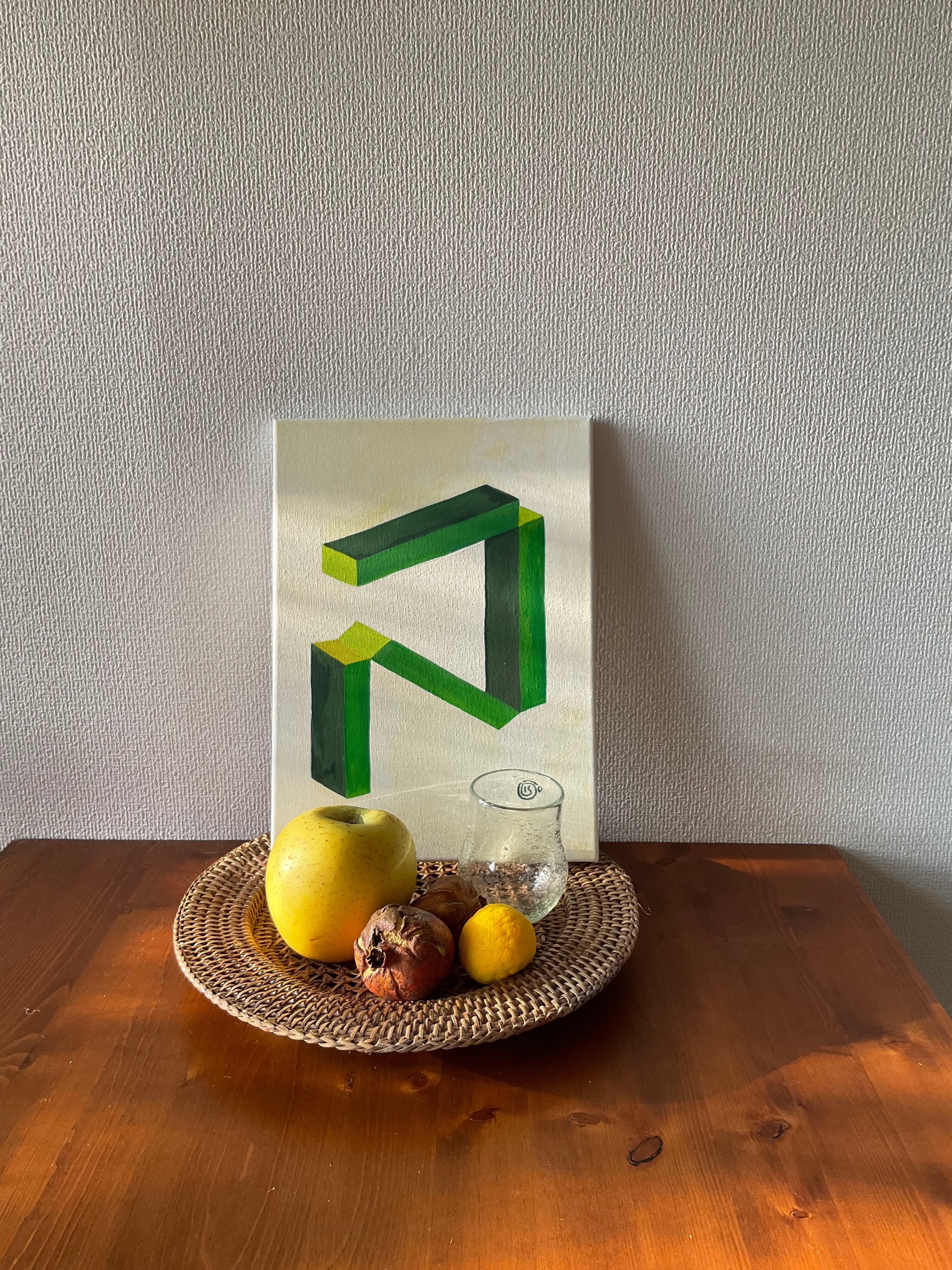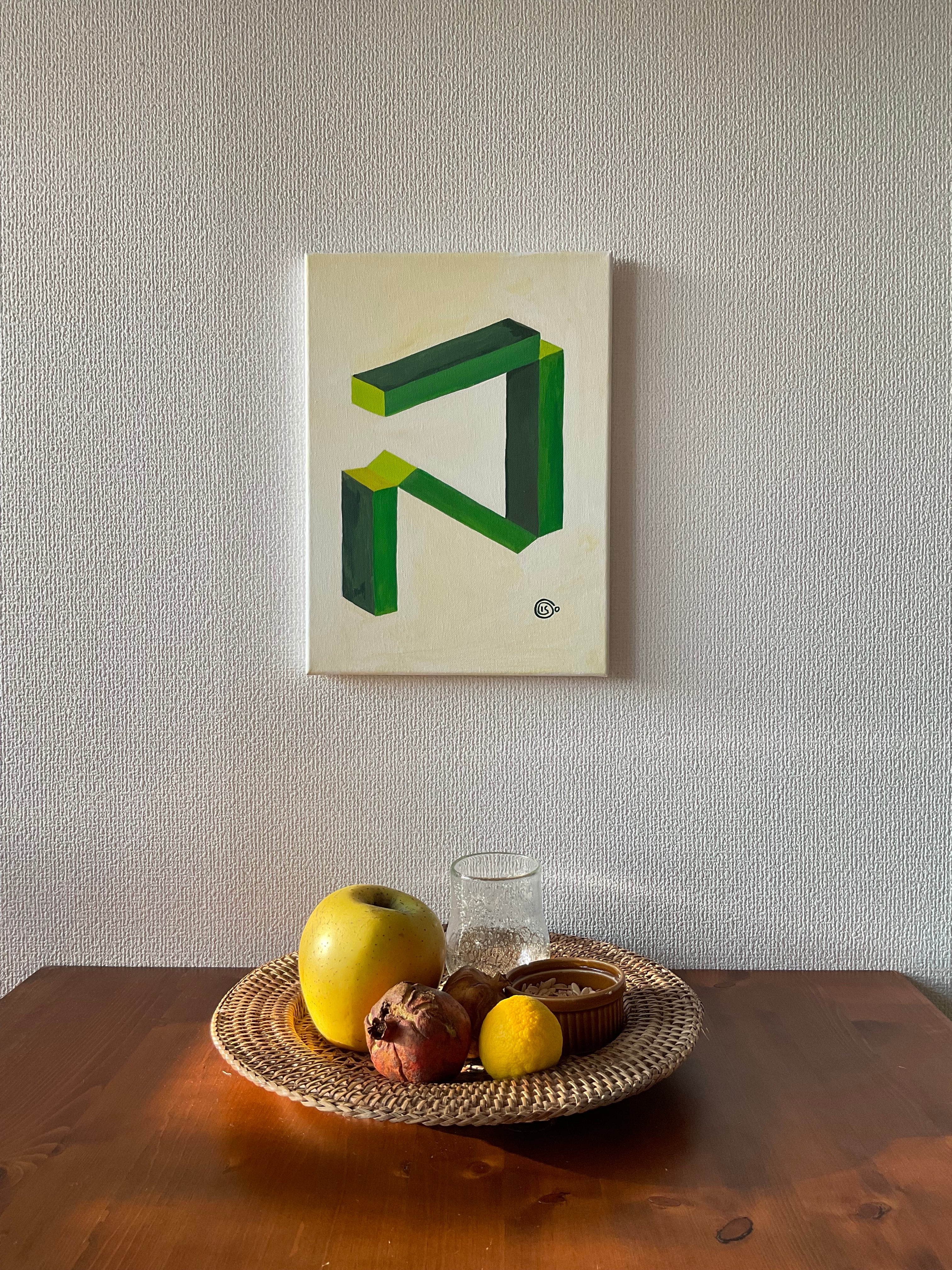 部屋に緑が欲しい。幾何学的な野菜の絵。スタイリッシュで遊びがある一枚が欲しい。そんな時に、一見野菜には見えないのですが、私やお手元に渡った方だけでも「実はこれは胡瓜なんだぞ…」とひっそり楽しんでもらえる作品が出来上がりました。ふざけた名前ですが、おすまししたり、ぷっと笑えたり、生活に人匙のユーモアが漂いますように。キャンバス自体軽いので、画鋲1つで壁にかけられます。