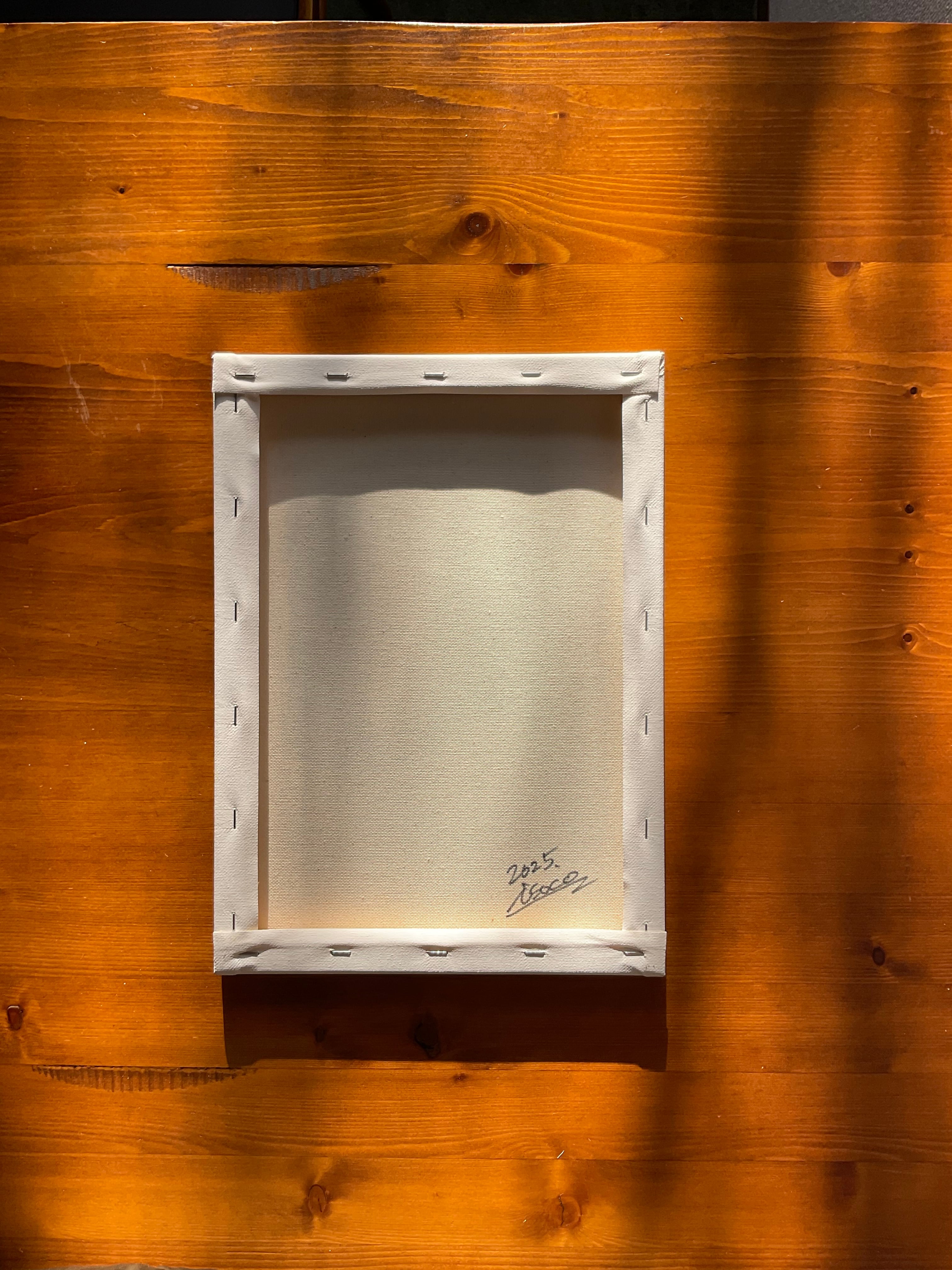 キャンバスは木枠にしっかりと固定されており、気軽に立てかけたり、壁にかけたりと使い方の自由度が高いのも魅力です。アートとしてだけでなく、インテリアアイテムとしても十分に存在感を放ちます。